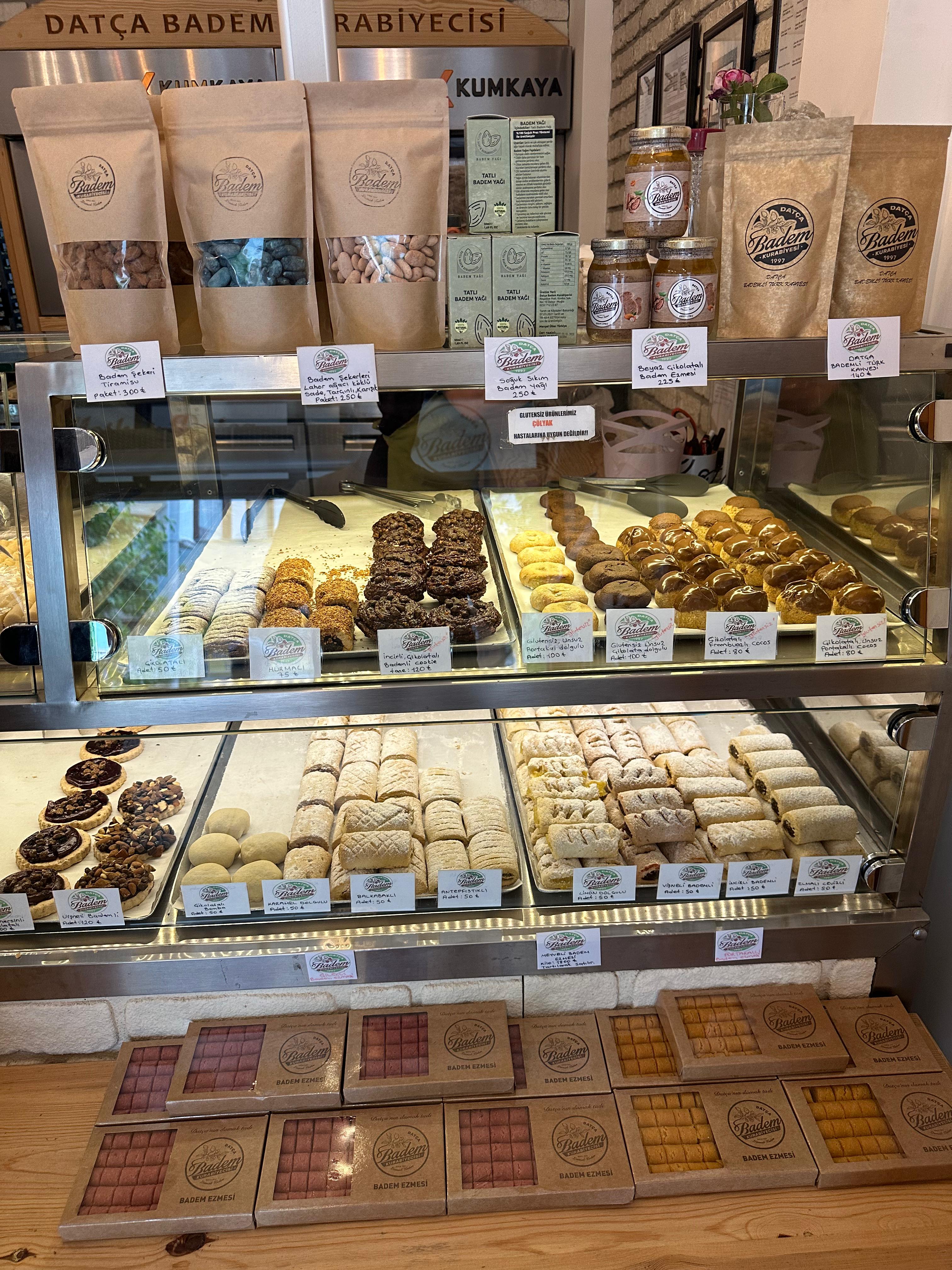 Datça için badem vazgeçilmez. Her şeyin bademlisi var: Bademli kahve, dondurma, gazoz, kurabiye… Badem çiçeği festivali de varmış. Kurabiye ve gazozu denedim.